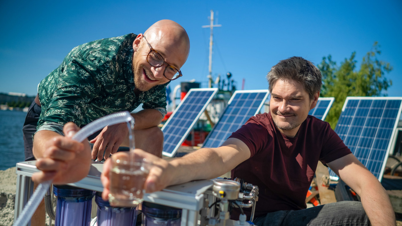 Juontajakaksikko kokeilee myös itse miten voi valmistaa juomavettä samalla suolanpoistoprosessilla, mutta energiatehokkaasti aurinkosähköllä.